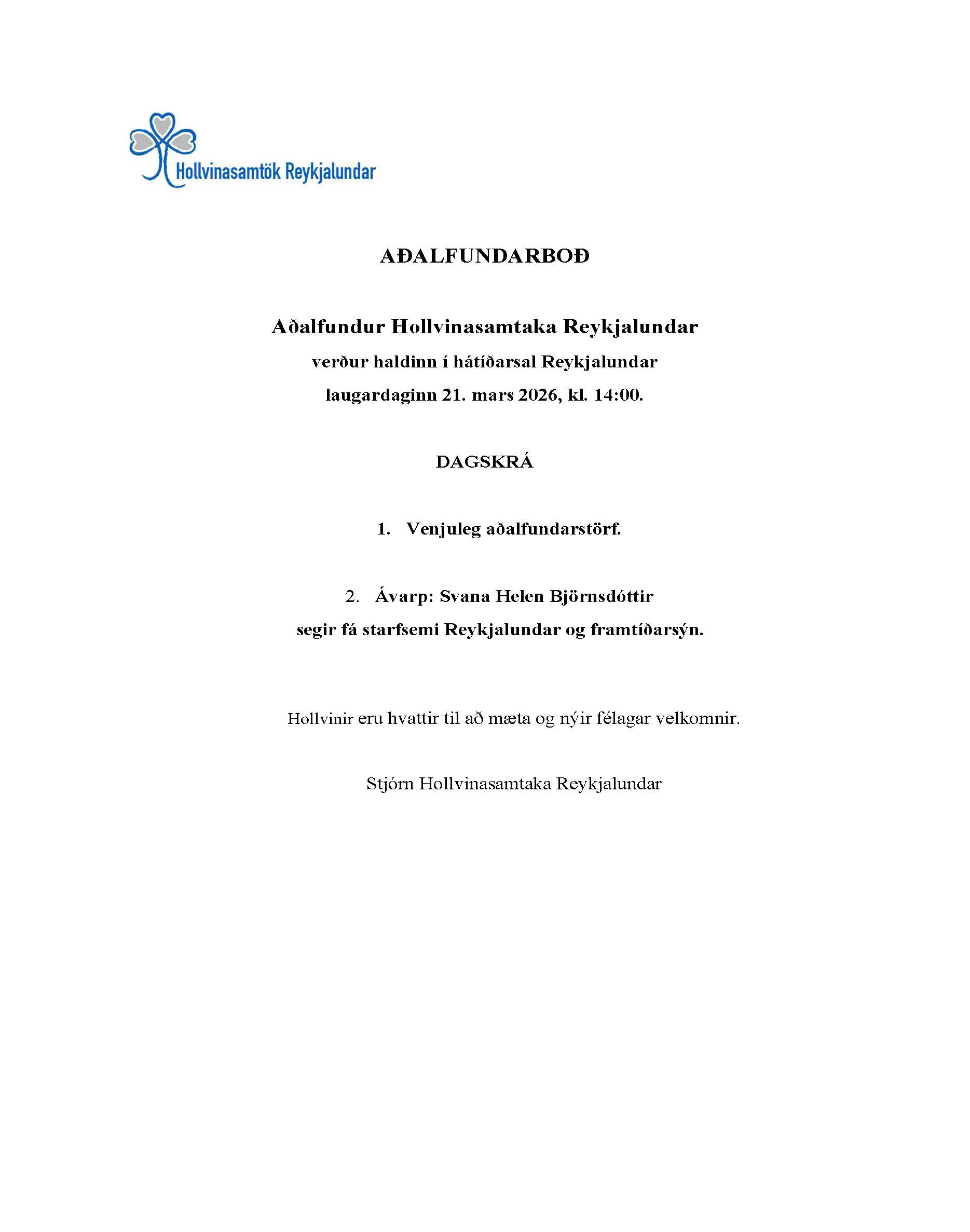 Aðalfundur Hollvinasamtaka Reykjalundar verður haldinn í hátíðarsal Reykjalundar laugardaginn 21. mars 2026, kl. 14:00.